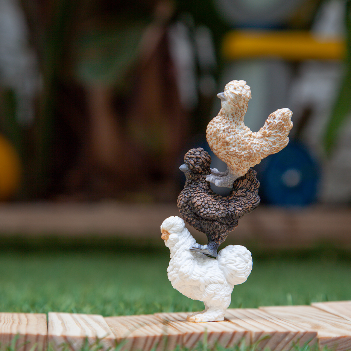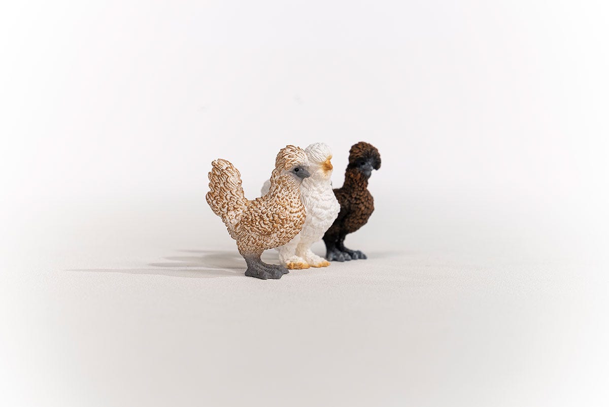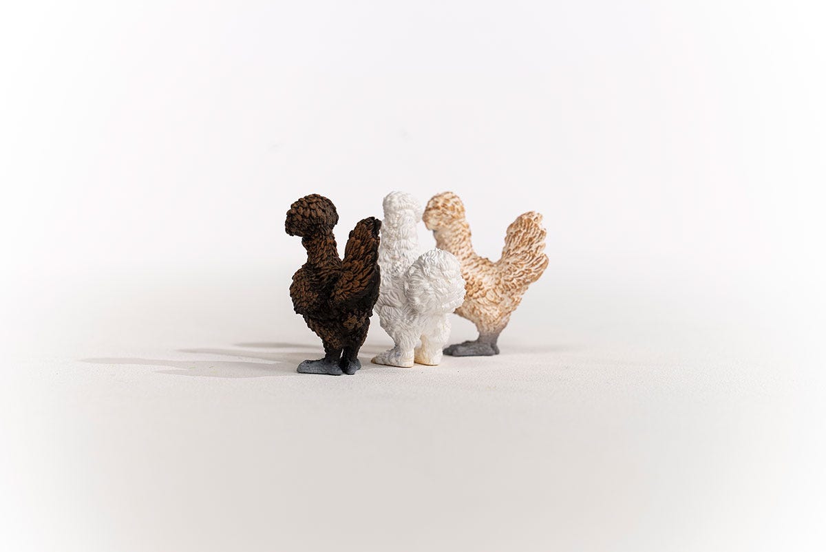 Cluck, cluck, we're all in luck! It's the Chicken Friends! These three fine-feathered friends are peck, peck, pecking their way into Schleich Farm World by popular demand. Includes two different Polish chickens and a Silkie chicken.