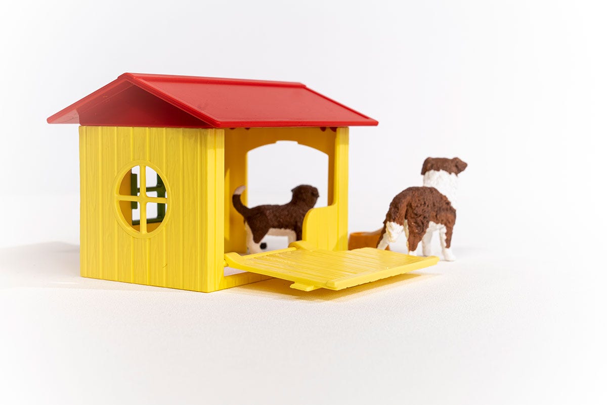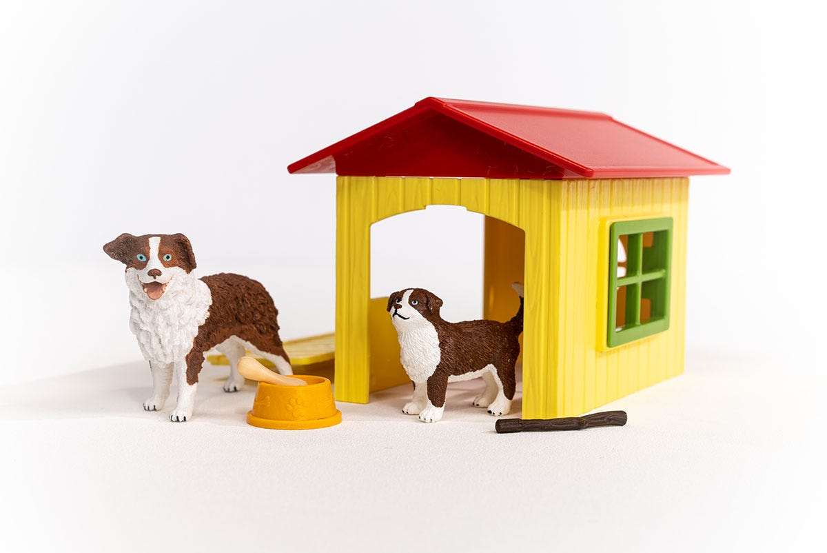 Awwwww...it's a mama Australian Shepherd and her pup! After helping the farmer round up sheep, these hard-working farm dogs are ready for a nap in the brightly colored dog kennel. The Friendly Dog House playset comes with the two dog figurines and their kennel, plus a toy bone, dog dish, and toy stick for puppy playtime and snacks. Rain or shine, the Friendly Dog House is home sweet home!