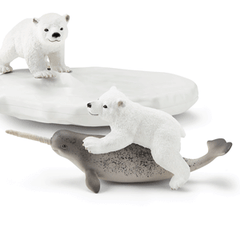 The two polar bears in the schleich® WILD LIFE Polar Playground have lots of fun on their ice floe: They hop and jump around wildly! Oh no!!! One of the polar bears ventured too close to the edge and fell in the water! Just as well that the friendly narwal is swimming around in the water nearby. It swims over right away to help the little polar bear back onto the ice floe!